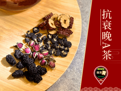 「桑葚」具有豐富的維生素A及花青素,對於抗氧化、抗衰老有幫助;「黑枸杞」有養肝明目及增強免疫力的功效;「玫瑰花」可緩解情緒、養顏美容;「紅棗」可補氣血,對於女性生理期間補氣血作用!